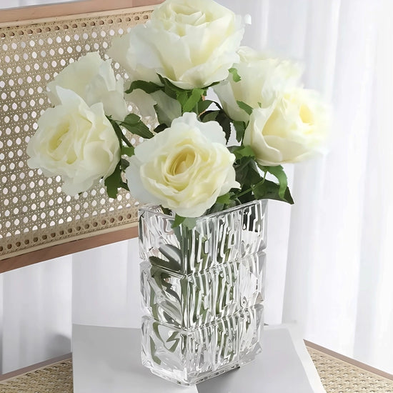 Découvrez un vase rectangulaire luxueux en verre facetté qui capte la lumière et sublime vos bouquets d’une touche scintillante. Ses lignes rayées et ses formes géométriques apportent du relief à votre décor.