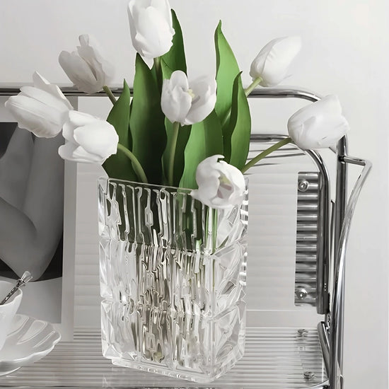 Vase Rectangulaire Rayé à Facettes, présentation avec bouquet de tulipes blanches sur une table blanche.